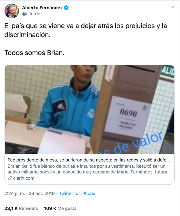 Días después, Brian Gallo recibiría un gesto de apoyo por quien resultaría ganador de las elecciones presidenciales, Alberto Fernández. “El país que se viene va a dejar atrás los prejuicios y la discriminación. Todos somos Braian”, había escrito el mandatario electo en su cuenta de Twitter.